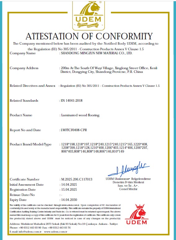 Flooring certifications: ISO14001, ISO45001, ISO9001, CE